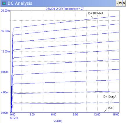 Рис.4.8. demo4_2. Семейство выходных характеристик I К(U К, I Б) биполярного транзистора, включенного по схеме с общим эмиттером.