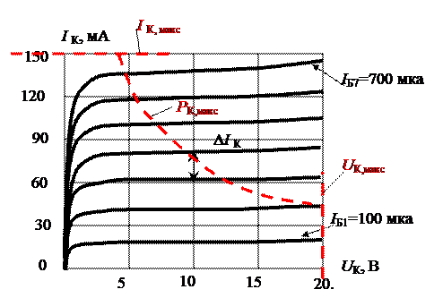 Эти значения определяют границы доступной для работы области выходных характеристик транзистора, которые изображены на рис.4.11 пунктирными линиями.