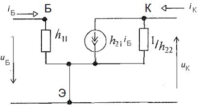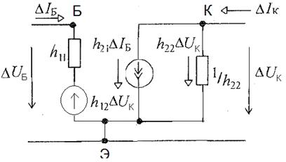 В этой схеме замещения цепь базы на основе первого уравнения представлена последовательным соединением резистивного элемента сопротивлением h 11 и зависимого источника напряжения h 12 ∆ U К. Цепь коллектора на основе второго уравнения представлена параллельным соединением зависимого источника тока h 21∆ I Б и резистивного элемента сопротивлением 1/ h 22.