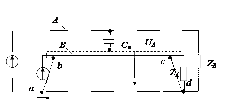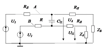 Обе линии имеют на схеме слева источники и справа приемники с некоторыми сопротивлениями. Между проводами A и B имеется распределенная емкость, которая на схеме отражена эквивалентным элементом C п.