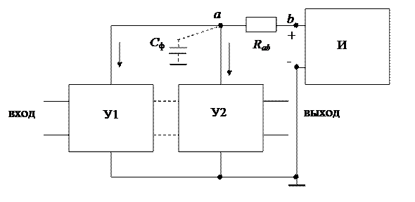 Кондуктивная связь возникает, например, когда несколько потребителей получают электрическую энергию от одного источника питания (рис.7.12). Здесь два усилительных устройства У1 и У2 питаются от одного источника постоянного напряжения И. В общем для обоих усилителей проводе ab ток равен сумме токов усилителей. Переменная составляющая i 2(t) тока усилителя У2 создает на сопротивлении провода Rab переменную составляющую напряжения u a(t)= Ea - Rab i 2(t). Часть этого напряжения через резисторы, устанавливающие режимы транзисторов по постоянному току, попадет на вход У1 и образует помеху.