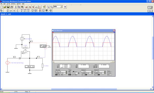 На рис.8.17 приведена схема модели тиристорного регулятора, в которой реализовано фазовое управление. В этой схеме тиристор управляется последовательностью прямоугольных импульсов, создаваемых генератором с частотой 50Гц (на экране красным цветом). Напряжение сети 220В частотой 50Гц (на экране синим цветом). В этой модели для простоты демонстрации сдвиг фаз управляющего тока и напряжения сети задается изменением начальной фазы источника 220В (в реальном тиристорном регуляторе изменяют начальную фазу источника управляющего тока).