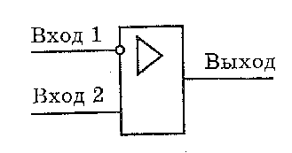 На электронных схемах операционный усилитель принято обозначать блоком в виде прямоугольника с выводами (рис.9.2.). При этом подразумевается, что внутри имеется полюс с нулевым потенциалом («земля»). Источники электрической энергии так же находятся внутри. Один из входов называется инвертирующим, т.к. при увеличении напряжения на этом входе напряжение на выходе уменьшается. Этот вход (на рис. 9.2 - «Вход1») помечается кружком или отмечается знаком «-».