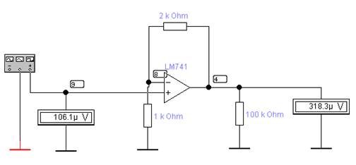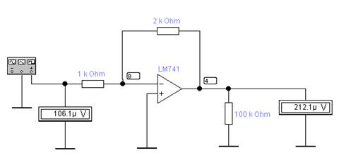 Рис.9.13. demo9_5. Схема опыта для определения коэффициента усиления инвертирующего усилителя напряжения с ОУ.
