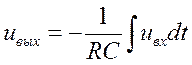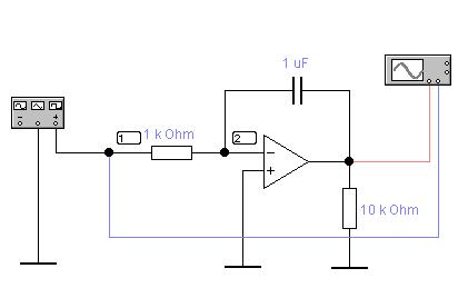 В отличие от усилителя в интеграторе используется емкостная отрицательная обратная связь. Если операционный усилитель можно считать идеальным, то в линейном режиме из схемы следует: