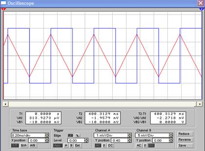 Рис. 10.10. demo10_4. Осциллограммы входного (синяя) и выходного (красная) напряжений интегратора.