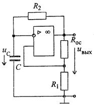 При включении источника питания напряжение на конденсаторе u C равно нулю и поэтому потенциал инвертирующего входа равен нулю. Напряжение на неинвертирующем входе равно U вх,неинв=β u вых >0, где β= R 1/(R 1+ R ос) –коэффициент положительной обратной связи. Напряжение на входе ОУ U вх =(U вх,неинв - U вх,инв) положительное. Поэтому u вых = E пит., т.е. ОУ находится в насыщении. Конденсатор начнет заряжаться к этому напряжению через резистор R 2. Как только напряжение на конденсаторе достигнет значения U вх,неинв и немного превысит его, напряжение на входе ОУ U вх =(U вх,неинв - U вх,инв) поменяет знак. Напряжение на выходе ОУ скачком изменит полярность и достигнет значения (- E пит). Теперь конденсатор начнет перезаряжаться на напряжение другой полярности. Процесс перезаряда и переключения ОУ в другое насыщенное состояние конденсатора будет периодически повторяться и установятся периодические колебания.