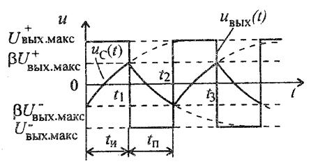 Принцип действия генератора основан на том, что вследствие перезаряда конденсатора изменяется входное напряжение операционного усилителя, усилитель переходит из одного насыщенного состояний +Uвых, макс в другое -Uвых, макс (рис. 10.21).