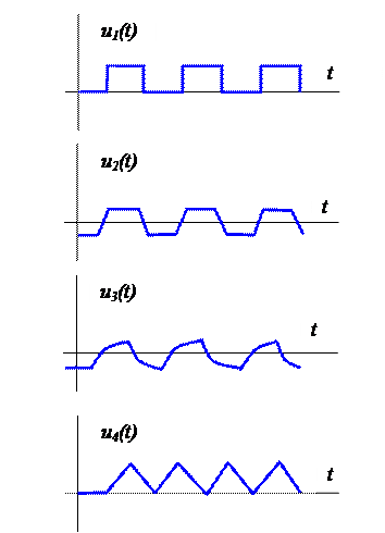 Рис.11.2. Идеальные импульсные последовательности формы прямоугольной (u 1), трапециидальной (u 2), экспоненциальной (u 3), треугольной (u 4).