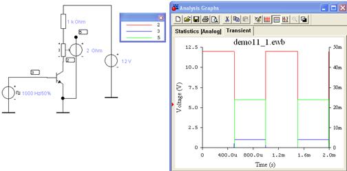 На рис.11.3а. приведены снимки из демонстрации графиков зависимостей входного напряжения u ВХ(t) в узле 2 (синяя), напряжения на коллекторе в узле 2 (красная) и тока коллектора (узел 5, зеленая).