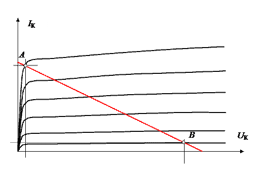 Перемена состояния, т.е. переход из точки В в точку А достигается изменением тока базы. В этом случае транзистор выполняет функции переключателя («ключа») и режим транзистора называют ключевым.