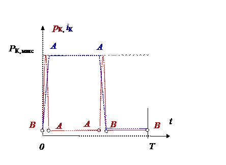 Энергия потерь в транзисторе за период складывается из потерь на интервалах времени двух фронтов и двух плоских вершин ΔT В. Графически энергия потерь выражается площадью фигуры, ограниченной кривой p К (t):