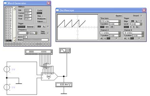 В этом примере с течением времени число на входе ЦАП с помощью генератора слова циклически изменяется с шагом 1 от 0 до 256. Поэтому на выходе ЦАП получается периодическая пилообразная кривая. При детальном рассмотрении оказывается, что это не гладкая, а ступенчатая функция с высотой ступеньки 2В/128 = 7.815мВ. Она может быть сглажена дополнительной фильтрацией.