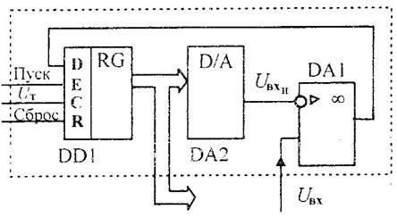 Здесь вместо счетчика включен регистр RG, который по команде «Пуск» устанавливает на выходе число в двоичном коде, начиная с 1 старшего разряда (и 0 в остальных разрядах). ЦАП создает напряжение U вхИ, соответствующее этому значению.
