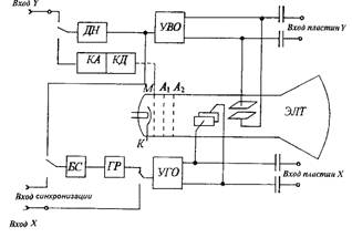 Рис.15.3 Структурная схема аналогового осциллографа.