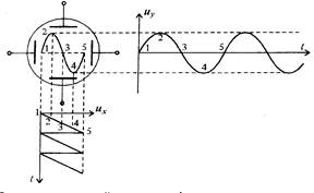 Принцип развертки поясняется рис.15.4. По оси x луч перемещается под действием пилообразного напряжения, т.е. циклически пропорционально времени. По оси y луч перемещается пропорционально мгновенному значению исследуемого сигнала.