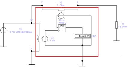 Ваттметр (выделен красной линией) имеет полюсы для подключения: токовые (I' и I), потенциальные (U' и U) и заземление. В модели цепь, в которую включается ваттметр, представлена источником V1 (с действующим напряжением 0.707В) и резистором R (с сопротивлением 10Ом). Ваттметр включен токовым портом последовательно с источником, а портом потенциальным – параллельно. При заданных параметрах ваттметр должен показать 0.7072/10=50мВт. Для отсчета значения в ваттметр включен индикатор UDC (в модели – вольтметр постоянного напряжения).