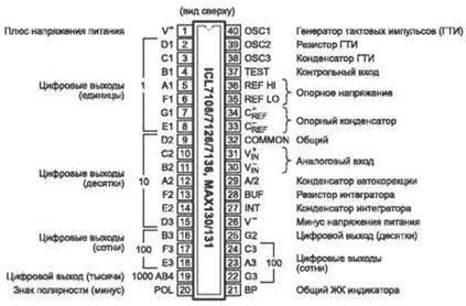 Основой всех современных цифровых мультиметров является интегральный АЦП напряжения. Одним из первых таких АЦП, пригодных для построения недорогих портативных измерительных приборов, был преобразователь на микросхеме ICL71O6, выпущенной фирмой MAXIM. На рис. 14.7 приведен внешний вид АЦП с указанием выводов. Для каждого десятичного разряда показаний (единицы, десятки, сотни, и тысячи) АЦП имеет выходы для семисегментных цифровых дисплеев (A,B.C,D,E,F,G) для индикации результатов в любом режиме измерений.