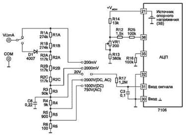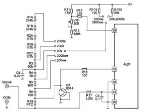 При измерении постоянного напряжения входной сигнал подается на цепочку резисторов R1...R6, с выхода которой через переключатель (по схеме 1-8/1... 1-8/2) подается на защитный резистор R17. Этот резистор, кроме того, при измерениях переменного напряжения вместе с конденсатором СЗ образует фильтр нижних частот. Далее сигнал поступает на прямой вход микросхемы АЦП, вывод 31. Инверсный вход микросхемы соединен с общем выводом 32–и отрицательным полюсом источником стабилизированного напряжения 3 В.