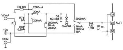 В режиме измерения постоянного тока (рис. 14.9) входная цепь (шунт для преобразования тока внапряжение) образована резисторами R8, R7 и R6, коммутируемыми в зависимости от диапазона измерения. Напряжения с этих резисторов через R17 подается на вход АЦП, и результат выводится на дисплей. Защита АЦП обеспечивается диодами D2, D3 (в некоторых моделях могут не устанавливаться) и предохранителем F.