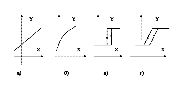 ИП характеризуется статической передаточной характеристикой- зависимостью выходного параметра (Y) от входного (X). Передаточные характеристики различных ИП (рис. 14.1) могут значительно отличаться (а -линейные, б- нелинейные, в- релейные, г - гистерезисные).