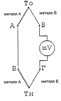 Термопара – соединение металлических проводников с разной работой выхода электронов. На рис. 14.6 – металлы разных типов А и B. На участках «АБ» и «ДГ» – любые проводники.
