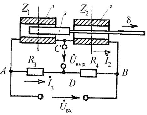 В следующем примере индуктивный датчик перемещения включен в мостовую цепь переменного тока. Мост питается от источника синусоидального напряжения. Особенность этой схемы заключается в том, что этот ИП является дифференциальным. В ИП встроены два индуктивных первичных преобразователя, в котором сигналы имеют противоположные по направлению изменения параметра – индуктивности катушек. Если, например, при перемещении ферромагнитного сердечника 2 индуктивность левой катушки 1 уменьшается, то индуктивность правой катушки 3 – увеличивается.
