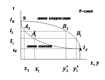 С помощью ректификации можно получить достаточно высокую степень разделения жидких смесей. Сущность процессов, из которых состоит ректификация, можно проследить с помощью t – x – y диаграммы.