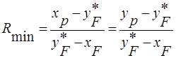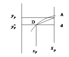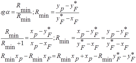 Расчёт Rmin. Величина отрезка В = х р/(R+1 ) зависит от R. С изменением R рабочая линия занимает положения в интервале DE. Выше точки D рабочая линия проходить не может, так как движущая сила становится отрицательной(y* - y <0), что не имеет физического смысла. В точке D движущая сила равна 0. Рабочая линия отсекает отрезок Bmax = y p/(Rmin+1). С увеличением R → ∞ отрезок В → 0 и точка пересечения рабочих линий Е лежит на диагонали диаграммы. Число флегмы, при котором работает реальный аппарат Rmin < Rg < Rmax = ∞. Найдём Rmin. Из точки D проведём горизонтальную линию.