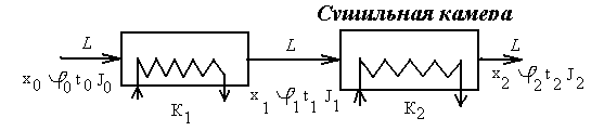 , См- теплоемкость высушенного материала, Св – теплоёмкость влаги. В сушилку подаётся сушильный агент, который содержит L кг/ч абсолютно сухого воздуха. Перед калорифером энтальпия воздуха I0 (Дж/кг), после калорифера (после нагрева) – I1. На выходе из сушилки отработанный воздух имеет энтальпию I2.