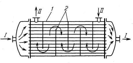 Кожух; 2-перегородки; I и II - теплоносители