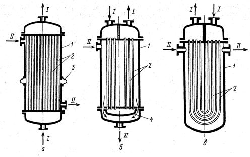 а-теплообменник с линзовым компенсатором (полужесткая конструкция); б-аппарат с плавающей головкой;