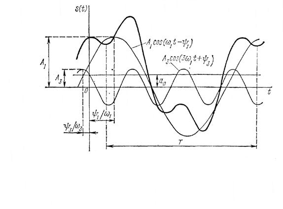 На рис. 3.3 показано сложное гармоническое колебание составляющей (qo) и двух гармонических составляющих с частотами ω1 и 3ω1 и амплитудами А1и А3 и сдвигами фаз ψ1 и ψ3.