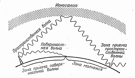 Короткие поверхностные волны довольно сильно поглощаются землей, не огибают препятствий и быстро затухают, но пространственные волны, достигая ионосферы земли, отражаются от нее и могут достигать радиоприемников на больших расстояниях, а иногда могут огибать весь земной шар, многократно отражаясь от земли и ионосферы.