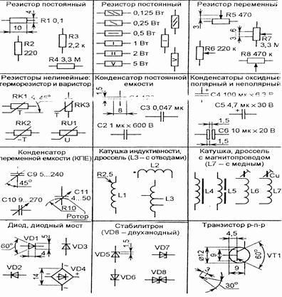 На практике наиболее часто применяются следующие элементы: резисторы, конденсаторы, катушки индуктивности, полупроводниковые диоды, транзисторы, интегральные микросхемы, элементы индикации, устройства коммутации и управления и др.