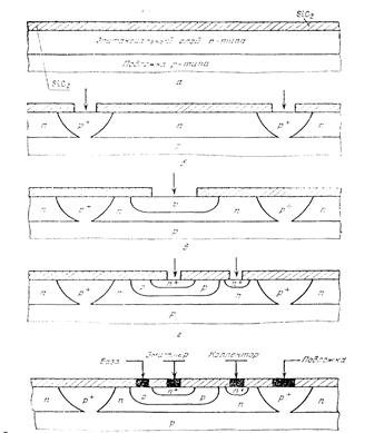 На рисунке 7.1. показано: а – подложка с эпитаксиальным слоем и изоляцией из двуокиси кремния; б – диффузия примем p-типа для получения диодной изоляции области с проводимостью n-типа; в – диффузия p-типа для создания эмиттера и контакта коллектора; д – транзистор с контактами базы, эмиттера, коллектора и подложки.