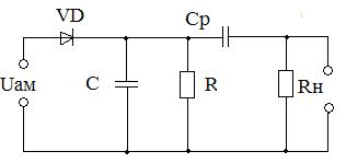 Из диода VD, RC – фильтра нижних частот, сопротивления нагрузки RH и разделительного конденсатора СР. Диод VD проводит ток положительных полуволн несущих колебаний, а RC – фильтр выделяет из них сигнал сообщения низкой частоты. Сопротивление нагрузки RH является входным сопротивлением следующим за детектором усилителя низкой частоты.