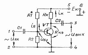 На рисунке 9.2 приведена принципиальная схема усилителя на транзисторе. «Транзистор VT, включенный по схеме с общим эмиттером» является усилительным элементом, получающим энергию от источника энергии EK в цепи коллектора.