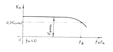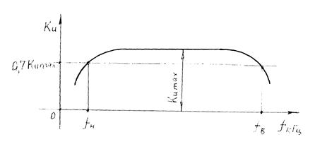 Она представляет собой зависимость коэффициента усиления от частоты входного сигнала при неизменной его амплитуде. На низких и высоких частотах усиление уменьшается, а на средних частотах усиление максимально. Область приблизительно равномерного усиления оценивают полосой пропускания усилителя, которого определяют на уровне 0,7 КUmax (или на уровне -3-х децибелл) по нижней fH и верхней fB частотам. Диапазон частот от fH до fB и есть полоса пропускания. Чем шире полоса пропускания, тем сложнее по форме сигналы может усиливать усилитель.