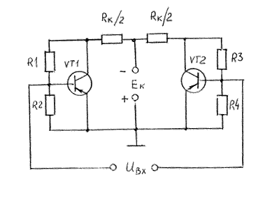 Каскад состоит из двух усилительных элементов VT1 и VT2. нагрузка коллекторов Rk разделена на две части. Питание Ек подключено между ними. Резисторы R1, R2 и R3 и R4 обеспечивают необходимое напряжение смещения на базы транзисторов. Входной сигнал подается одновременно на базы транзисторов.
