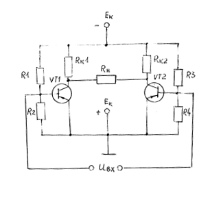Мостовая схема по принципу действия мало отличается от дифференциальной, но нагрузка RН, которую нельзя разделить пополам, включена между коллекторами транзисторов VT1 и VT2.