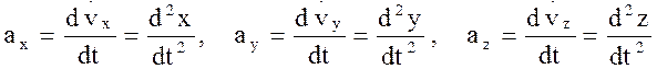 2. Проекции ускорения на оси координат равны первым производным от проекций скоростей точки или вторым производным от соответствующих координат точки по времени: