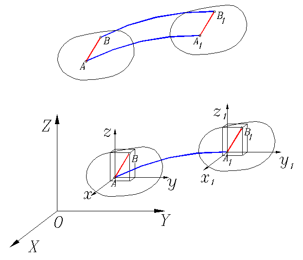 Т. к. при поступательном движении оси координат остаются параллельными своему начальному направлению, координаты любой точки (например т. В) твердого тела в подвижной системе отсчета остаются постоянными, а ее движение тождественно движению т. А.