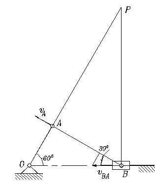 3. Такой же результат получим при определении скоростей, используя мгновенный центр (МЦС). Проведем линии АР, ВР перпендикулярно направлениям скоростей в этих точках. Точка их пересечения является МЦС.