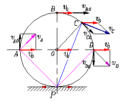 Решение. Так как колесо катится без скольжения, скорость в точке касания Р − vР= 0. Точка Р является мгновенным центром скоростей. Скорости точек равны произведению угловой скорости на расстояние от точки до полюса и направлены перпендикулярно к линиям, которые соединяют эти точки с полюсом.