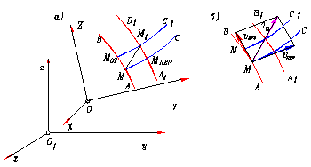 Рассмотрим сложное движение точки М, перемещающейся по отношению к подвижной системе отсчета Oxyz, которая в свою очередь движется относительно другой системы отсчета О1x1у1z1 , которая считается неподвижной. Каждая из этих систем отсчета связана с определенным телом.