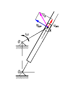 В качестве переносного движения относительно неподвижной системы координат примем вращательное движение кулисы.