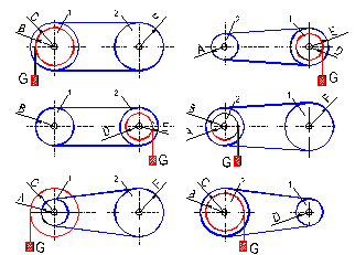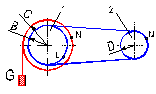 Пример. Дано: радиусы шкивов В, С, D, начальная угловая скорость ременной передачи ω0 =0, угловое ускорение шкивов 1 ε1 (1/c) при запуске.