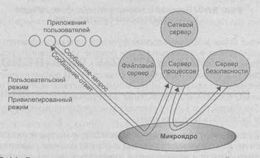 Суть микроядерной архитектуры в следующем. В привилегированном режиме остается работать только очень небольшая часть ОС, называемая микроядром.