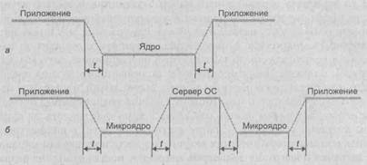 Производительность. При классической организации ОС (рисунок 5, а) выполнение системного вызова сопровождается двумя переключениями режимов, а при микроядерной организации (рисунок 5, б) - четырьмя.